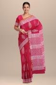 Bagru Discharge Red Buta Hand Block Printed Cotton Zari Saree
