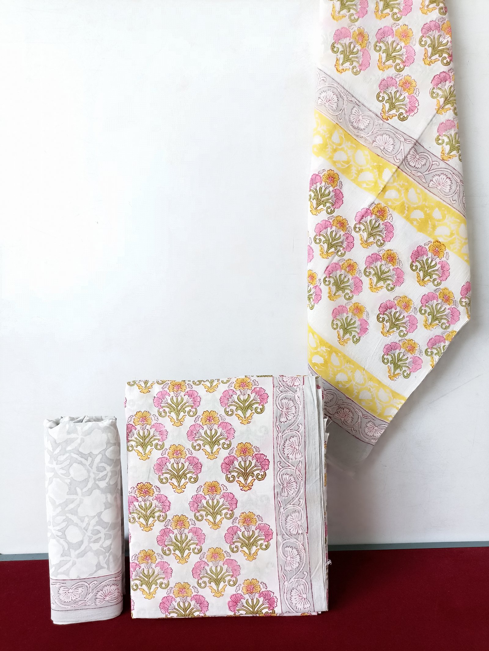 Cotton hand block print Suit material. Hand block printing is done by help of wooden blocks, Bagru ( Jaipur ) is famous for such a printing. The Cotton Shirt length fabric is paired with self or matching block printed Cotton Bottoms and complementing Cotton Dupattas. Hand block print always give a decent, classy and elegant look. This suit can be paired with sandals and traditional Jewelry for chic look. Its best gift for any women and girl. This suit material give a classy look as kurta pant, kurta palazzo. kurta chudidar and kurta salwar.