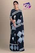 Black & White Square Buta Hand Block Printed Cotton Malmal Saree