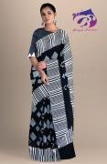 Black & White Square Line Hand Block Printed Cotton Malmal Saree