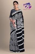 Black & White Jaal Hand Block Printed Cotton Malmal Saree