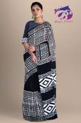 Black & White Plain Dot Hand Block Printed Cotton Malmal Saree