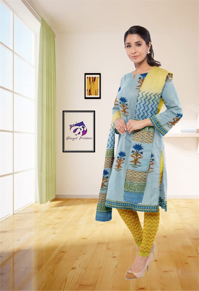 Bagru Multi Sky Blue Hand Block Printed Unstitched Cotton Suit - Set With Cotton Dupatta
