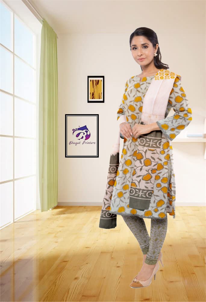 Bagru Multi Grey Buta Hand Block Printed Unstitched Cotton Suit - Set With Cotton Dupatta