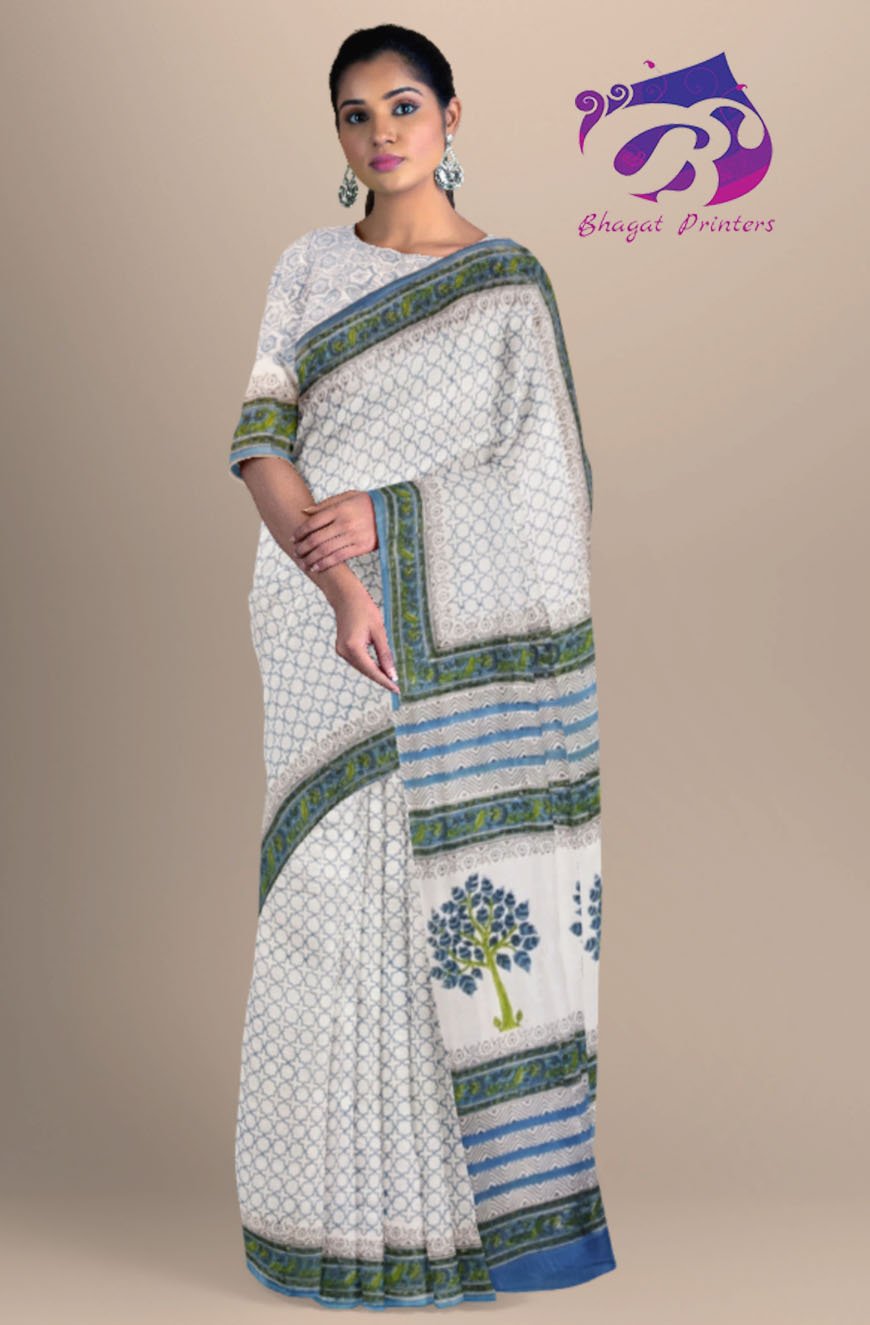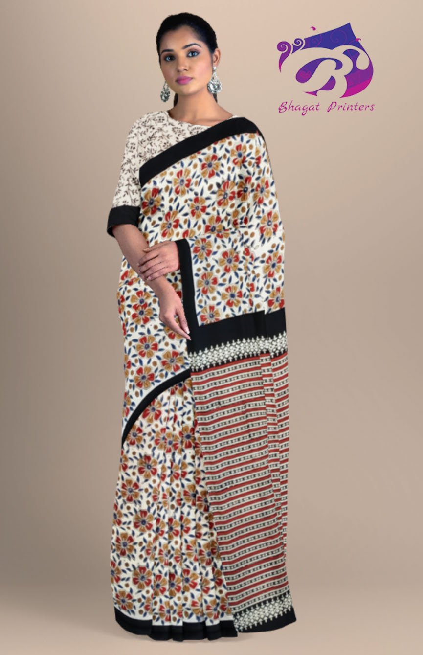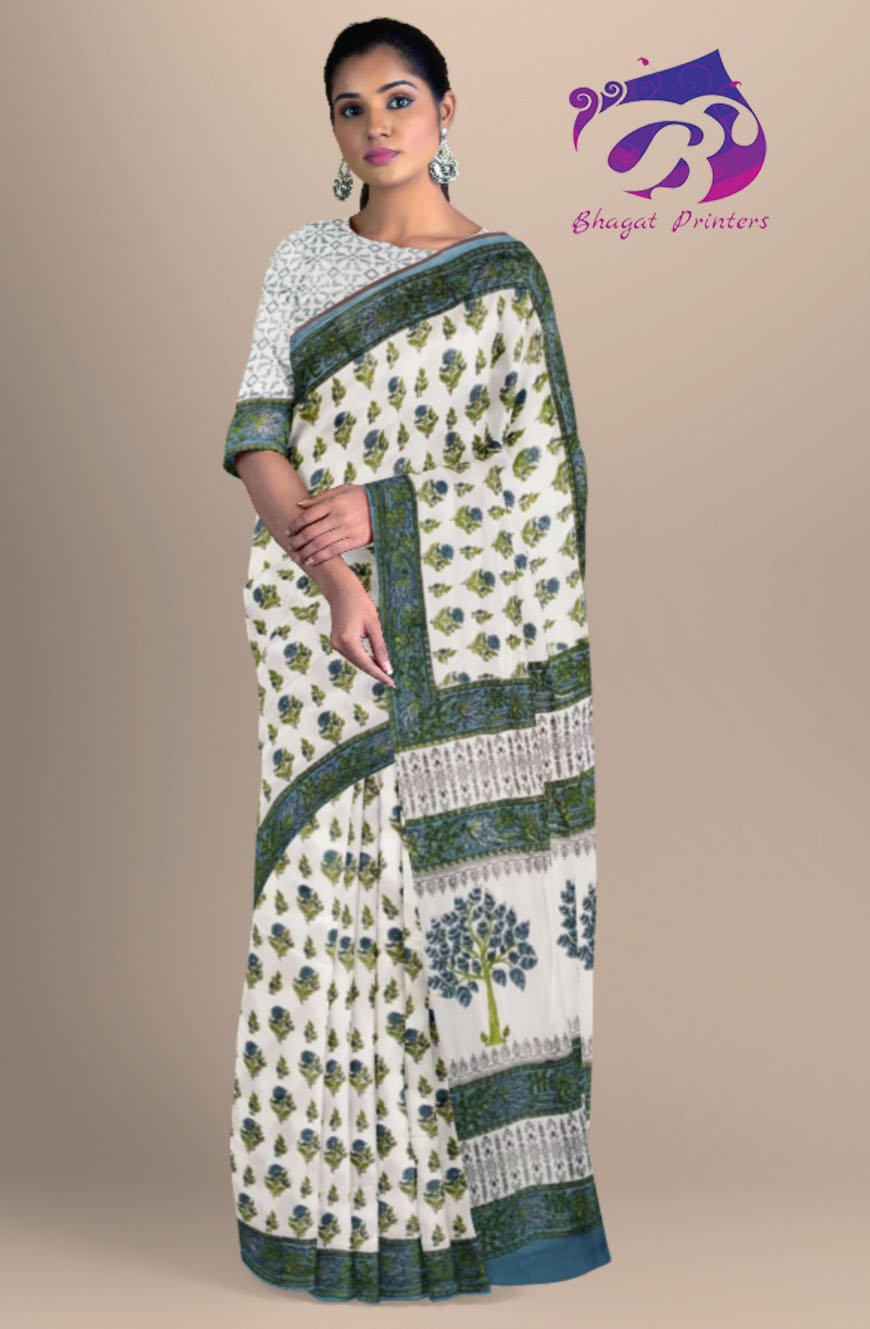 Bagru Kalamkari Flower Hand Block Printed Cotton Malmal Saree