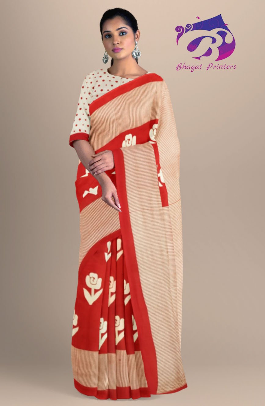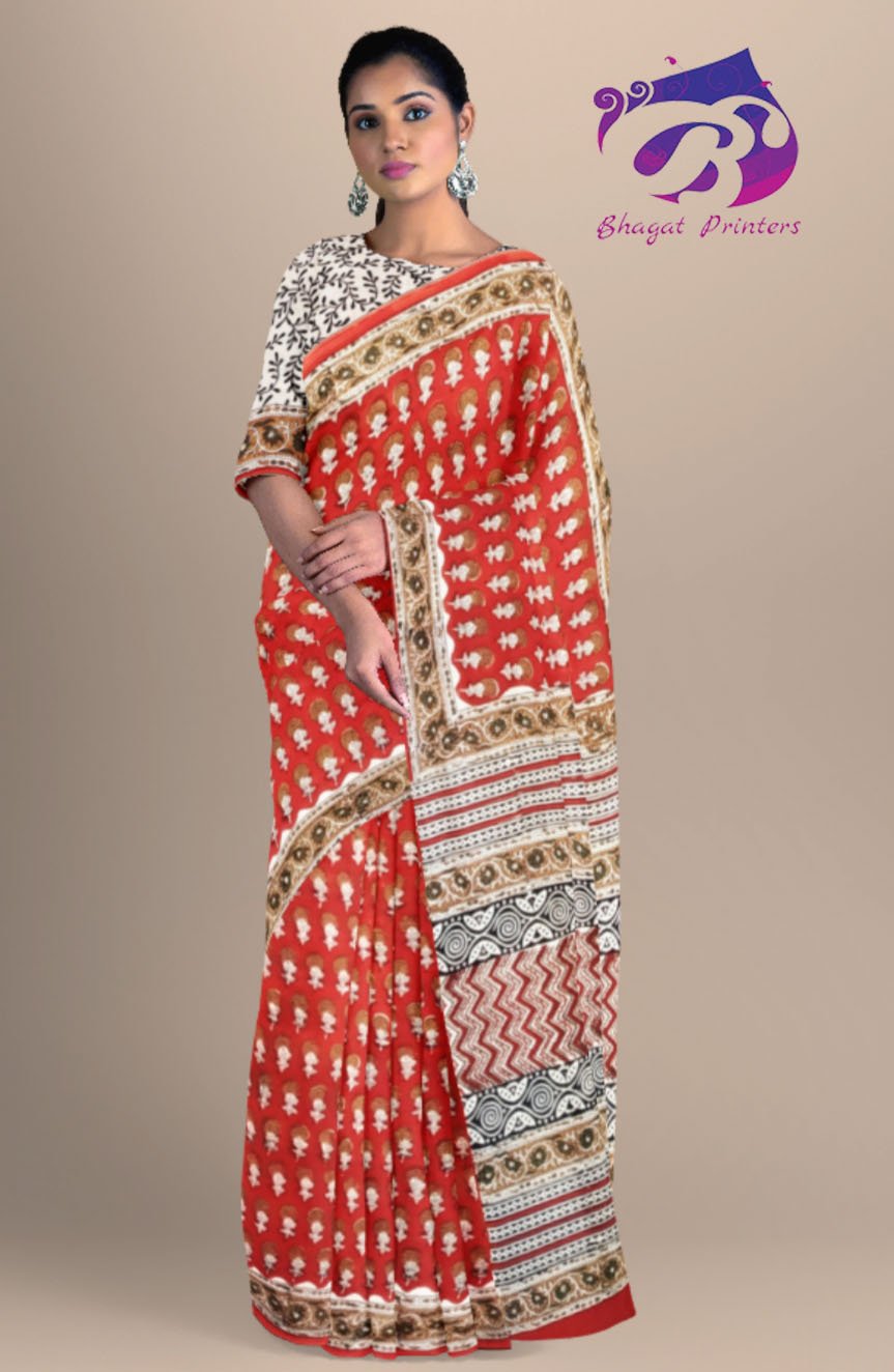 Bagru Kalamkari Red Buti Hand Block Printed Cotton Malmal Saree