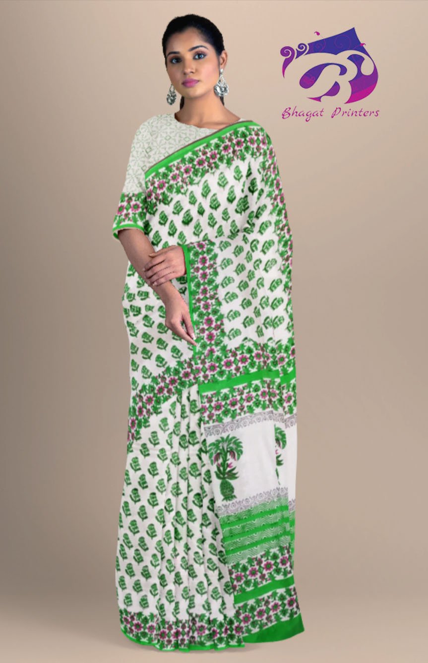 Bagru Multi Green Buti Hand Block Printed Cotton Malmal Saree