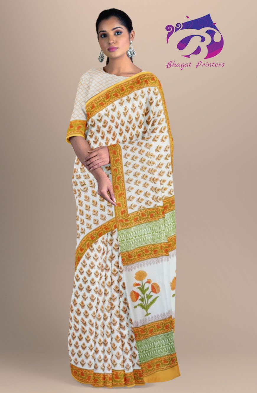 Bagru Multi Mustard Buti Hand Block Printed Cotton Malmal Saree