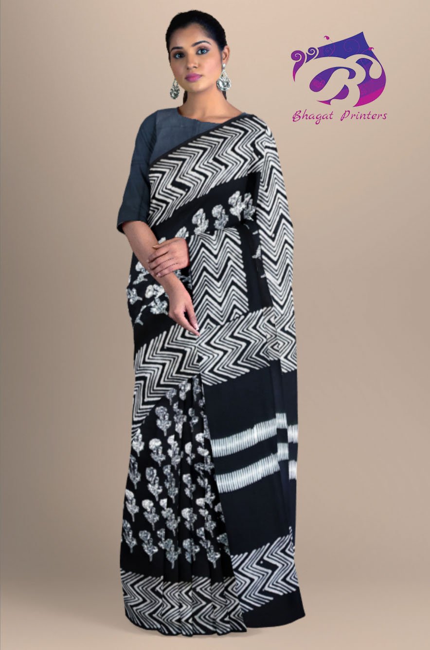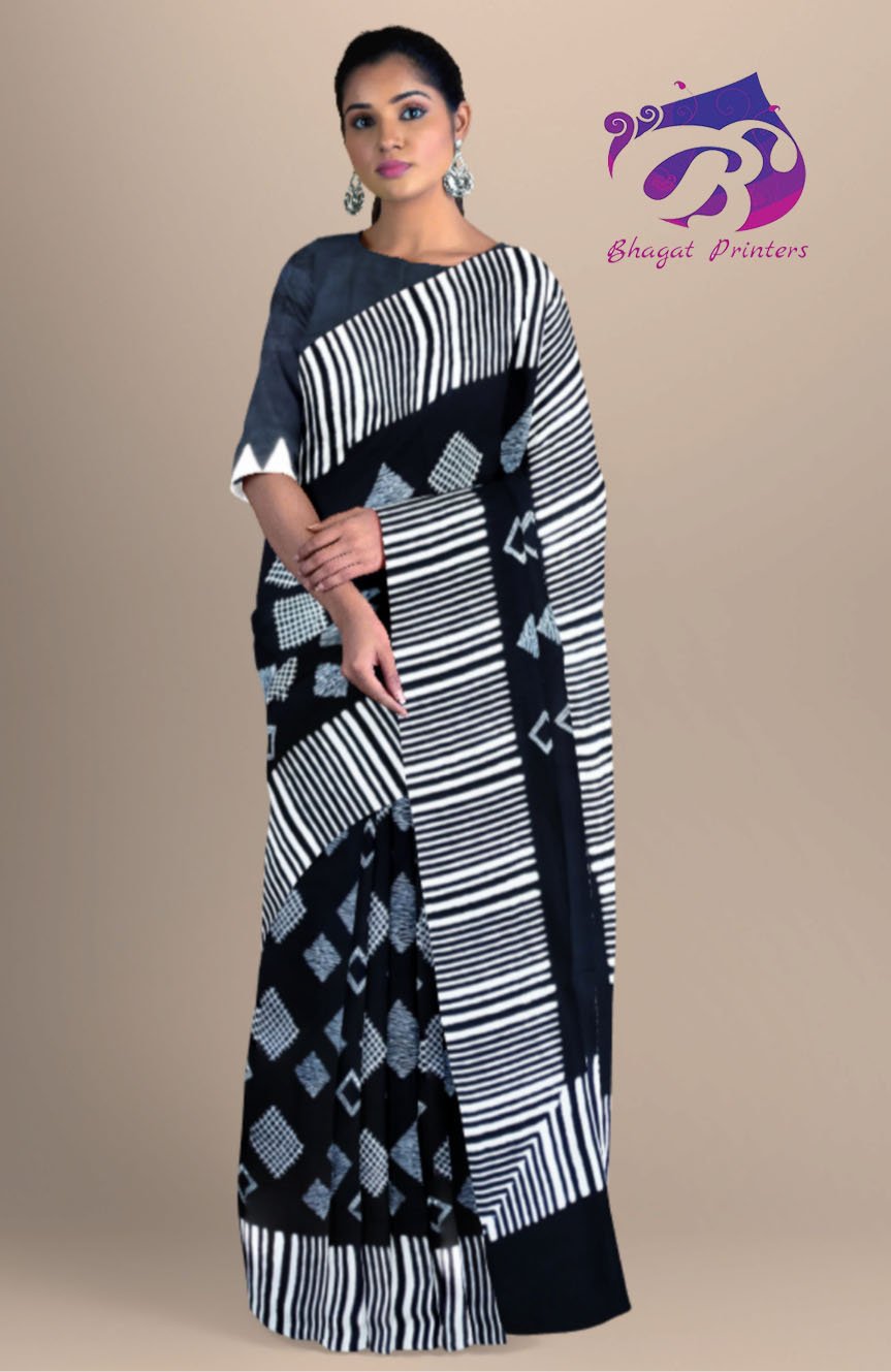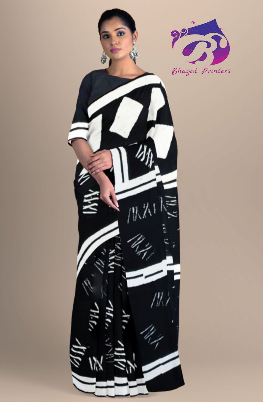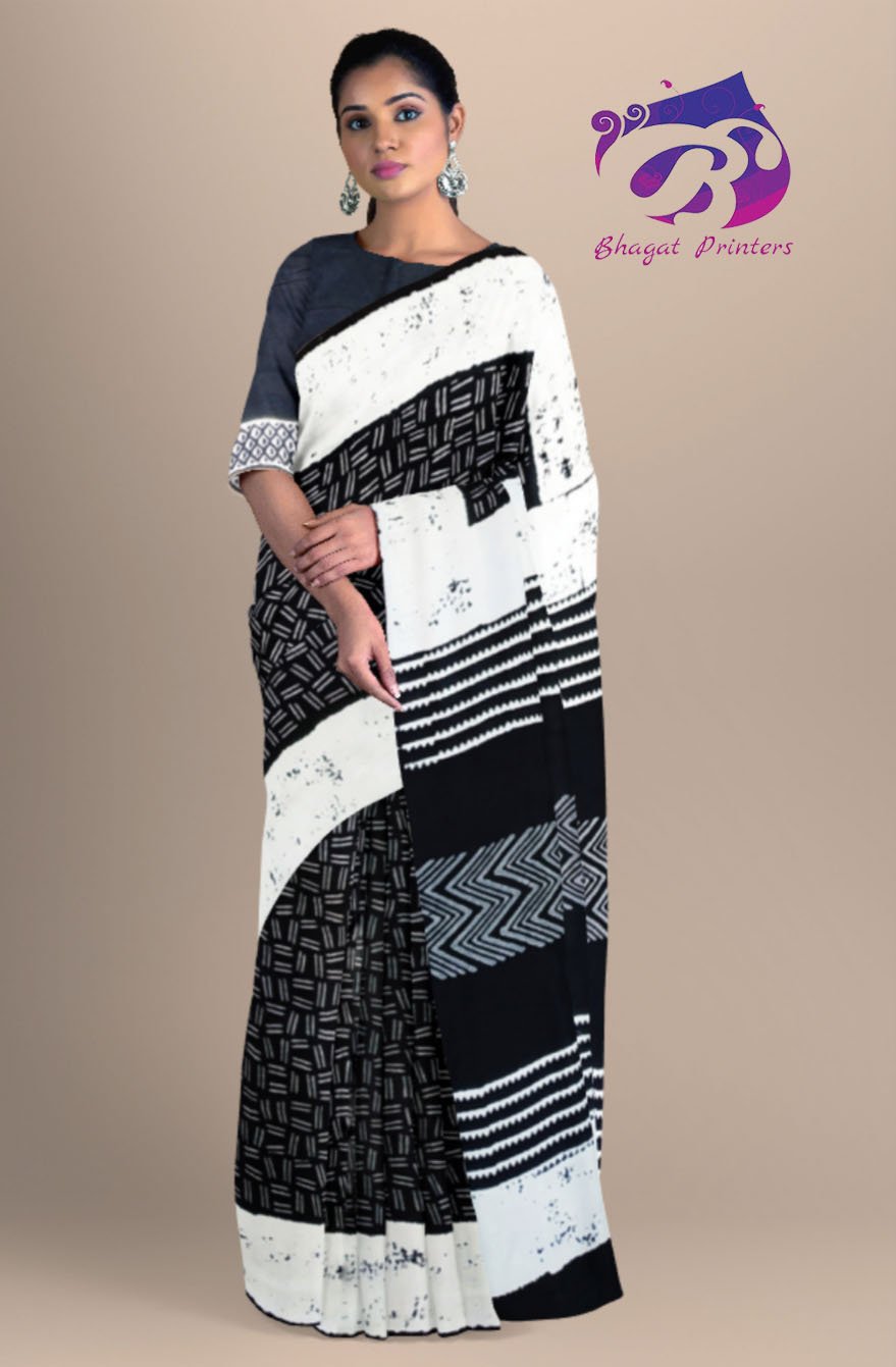 Black & White Plain Chips Hand Block Printed Cotton Malmal Saree