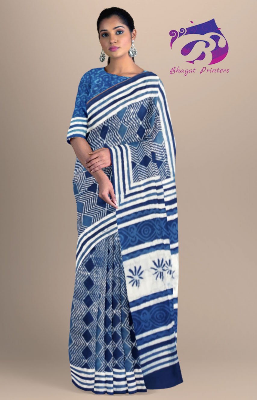 Indigo Geometrical Hand Block Printed Cotton Malmal Saree