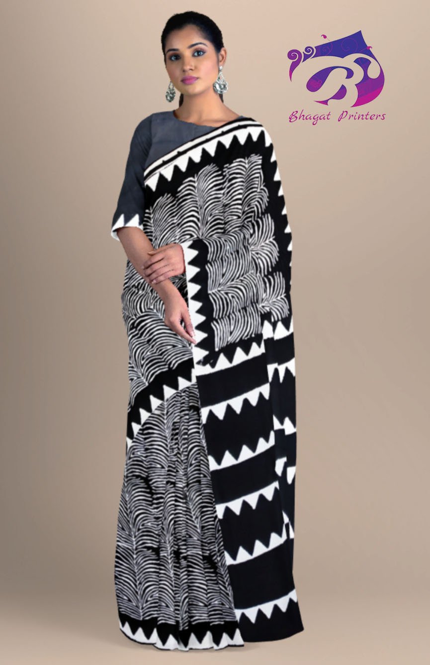 Black & White Pan Patta Hand Block Printed Cotton Malmal Saree