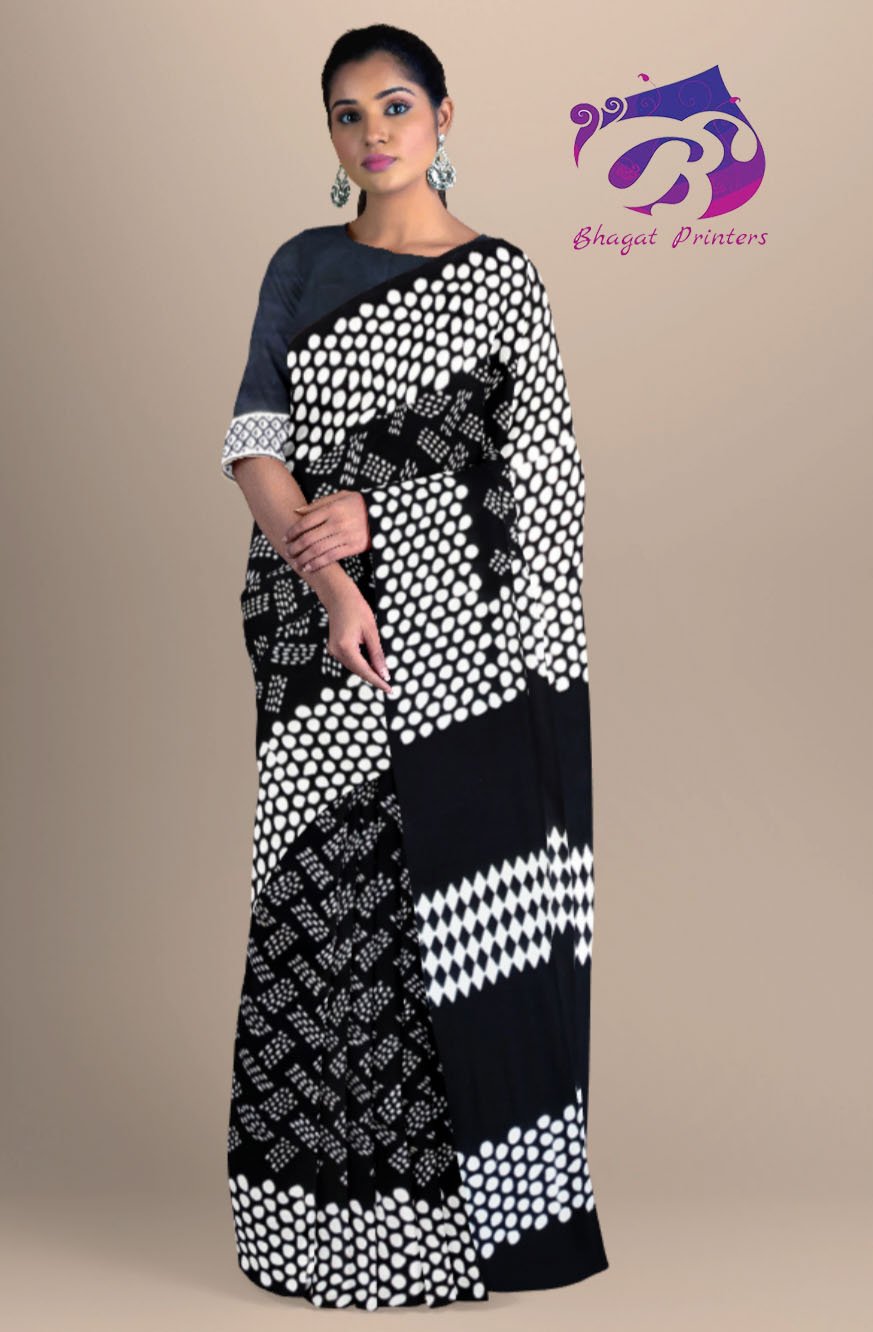 Black & White Plain Dot Hand Block Printed Cotton Malmal Saree