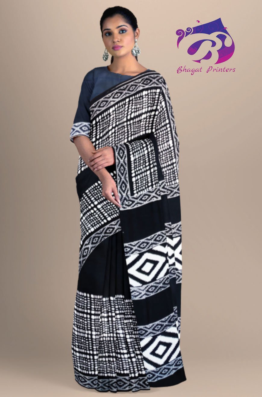 Black & White Square Skretch Hand Block Printed Cotton Malmal Saree
