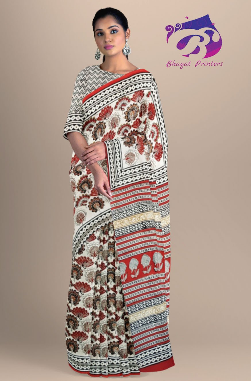 Bagru Kalamkari Pan Jaal Hand Block Printed Cotton Malmal Saree