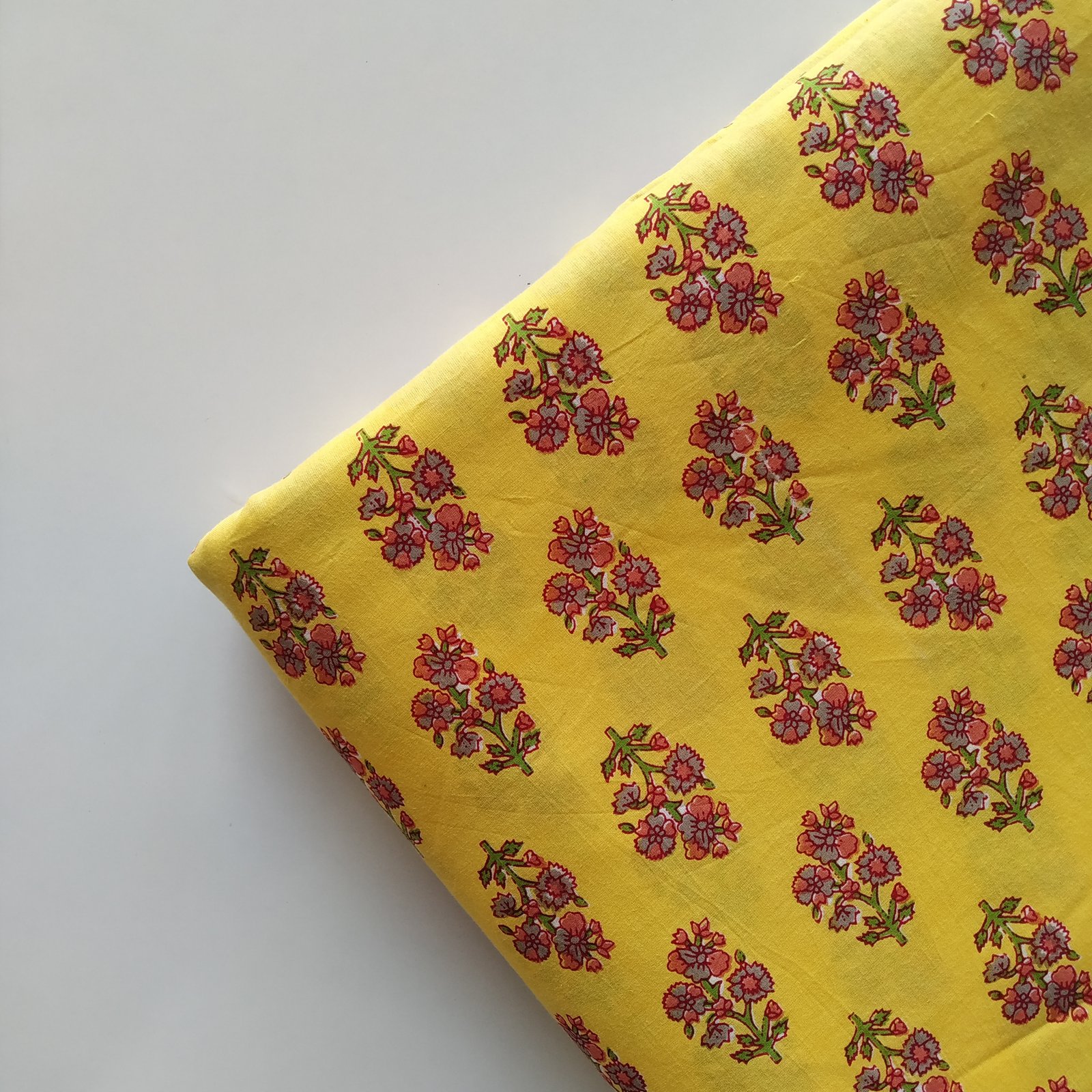 Yellow Base Buta Hand Printed Cotton Fabric Per Meter