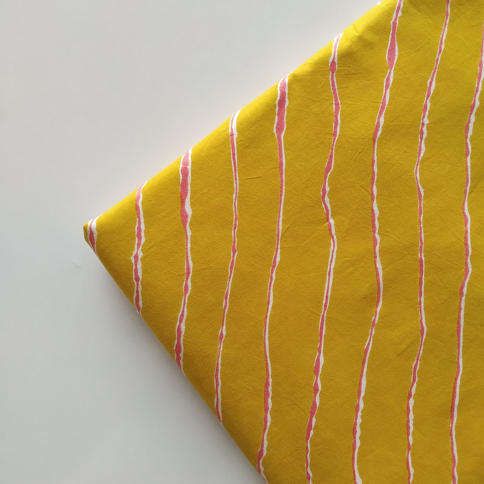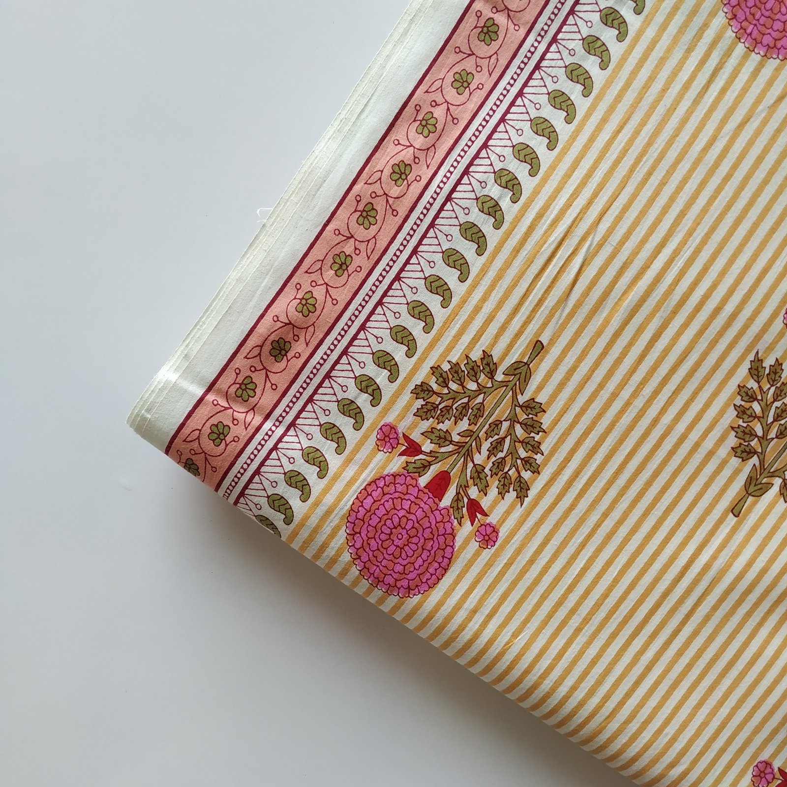 Mustard Stripe Pink Buta Hand Printed Cotton Fabric Per Meter
